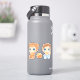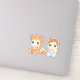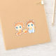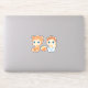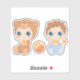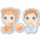 Bebês bonitos de desenho animado em rompers. A da esquerda está vestida com um macacão de urso marrom com uma bib amarela com uma pequena abelha. A da direita está vestida com um pano azul com uma bib amarela e segurando um bebê chocalho. A bola brilhante está descansando entre eles.