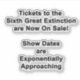 Um VESTIDO com as palavras "Tíquetes à Sexta Extinção do Excelente estão à venda! Mostrar datas estão se aproximando exponencialmente" impresso em letras negras na frente. Trata-se de promover a sensibilização para o efeito prejudicial que as alterações climáticas têm em todos os seres vivos.