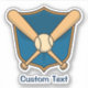 Ícone de beisebol com dois morcegos e uma bola sobre um escudo azul. Texto personalizado.