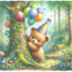 Bebê ursinha de aniversário para uma garotinha ou festa de aniversário de menino. Filhote de urso doce, filhote, por uma árvore cercada por balões de aniversário em azul, amarelo, verde, laranja e roxo.