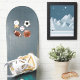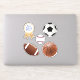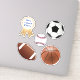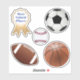 Folha temática estiva de adesivos com gráficos de uma bola de futebol, baseball, futebol, basquete e uma fita de ouro. Personalize o texto azul em negrito, na fita, para ler o que você quer.
