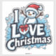 Um alegre boneco de neve de desenho animado vestindo um chapéu vermelho e cachecol está acima das letras em negrito 'LOVE' e 'Christmas', transmitindo calor, alegria e espírito festivo de feriado para cartões de feriado, faixas e decorações.