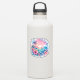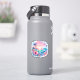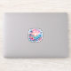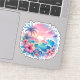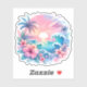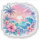 Bonito Vinheta de Oásis Tropicais. Linda arte pastel rosa e azul costeira com palmeiras, flores tropicais, um pôr do sol e ondas oceânicas. Bonito arte tropical para dar a sua casa uma sensação de beleza!