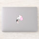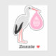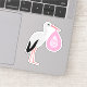 Este adesivo em forma espetacular apresenta uma imagem gráfica de uma bela Tempestade branca com penas de cauda pretas segurando-as num pacote de cobertores cor-de-rosa claro. Há um texto cor-de-rosa no pacote que diz "Menina". Esta design é perfeita para celebrar uma menina.