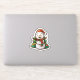 Um bonitão vestindo um chapéu vermelho brilhante de Papai Noel e um cachecol aconchegante fica alegremente entre árvores decoradas de Natal. Os ornamentos coloridos pendem das ramificações, criando uma atmosfera festiva.