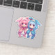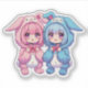 Cute pair of chibi bunny twins dressed in pastel pink and blue fluffy hooded rabbit costumes.