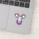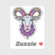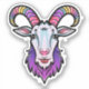 Um adesivo branco de cabra com uma expressão brincalhona, vestindo um chapéu colorido e padronizado. A design de captura de olhos apresenta um par de chifres curvos, uma barba de barba e um sorriso viscoso. O fundo é um gradiente pastel de rosa, roxo e azul, criando uma atmosfera vibrante e alegre.
