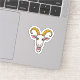 Um design de cabeça de cabra branca com uma cabra do estilo cartoon com olhos grandes e expressivos e um sorriso largo e brincalhão. Os chifres da cabra têm a forma de chapéus de festa e têm bruxelas penduradas neles. O design geral é vibrante e alegre, perfeito para decorar cartas, notas ou postas nas mídias sociais. O adesivo transmite uma sensação de humor divertido e leve.