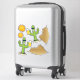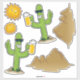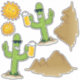 Cartoon de cacto sorridente com óculos de sol segurando uma caneca de cerveja e dando polegares. Sol e monta ícones.