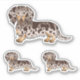 A ilustração original de um desenho animado de cabelo comprido e bonito, chocolate castanho e casaco de maçã bronzeada, cão da raça Dachshund. O design é colocado três vezes na folha em dois tamanhos diferentes. Há um maior e dois menores.