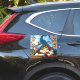O gato Calico brincando com um dragão chinês vermelho em frente a uma janela de vidro colorido de pavão.