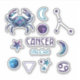 Celebrate the intuitive and protective nature of Cancer with this beautifully detailed zodiac sticker collection. Featuring celestial artwork of the Crab, the Cancer constellation, zodiac symbol, Water element symbol, and Moon ruling planet symbol, this design is surrounded by dreamy moons, planets and stars for a magical cosmic feel.
