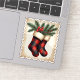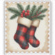Um design de selo festivo com uma xadrez de natal cheia de amoras ocas e agulhas de pinheiro, colocado sobre um fundo de natal.