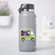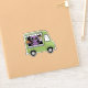 Uma alienígena roxa engraçada num caminhão de comida verde com uma fatia de pizza e batatas fritas