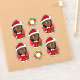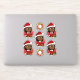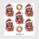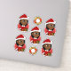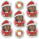 Conjunto de sete adesivos de vinilo cortados com uma ilustração de uma menina africana-americana feliz e bonita, sorrindo de cabelo longo, vestida de Natal e vestindo um chapéu vermelho de Papai Noel, em fundo vermelho; cinco adesivos da menina e dois adesivos com uma coroa de Natal