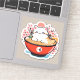 Un adorable chat profitant d'un bol de ramen, entouré d'éléments japonais colorés comme des fleurs de cerisier et des lanternes, le tout illustré dans un style ludique et chaleureux.