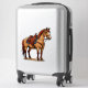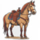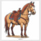 Um cavalo marrom brilhante está em perfil, equipado com um coxim de sela acolchoado vermelho, bridão de couro e arreios de montaria. Ideal para temas equestres, montaria, estábulo e treinamento em coleções de estoque.