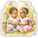 Garotas gêmeas bonitas de chás de fraldas florais cor-de-rosa. Meninas aquáticas sentadas em flores rosa.