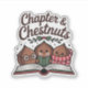 A playful holiday design featuring "Chapter & Chestnuts" with three adorable chestnuts gathered around an open book. One wears glasses, another sips cocoa, and the third is wrapped in a striped Christmas scarf. Holly leaves, stars, and snowflakes frame the design in a vertically symmetrical layout perfect for cozy readers and book lovers.