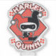 Confira Chibi Harley Quinn enquanto ela faz as divisões em frente a um pano de fundo de diamante de bolinhas vermelha com seu nome escrito em volta dela.