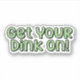 Uma design de tipografia divertida com as palavras "Get Your Dink On!" em uma fonte retrógrada verde. Este design faz uma ideia de presente de excelente para jogadores de picleball!