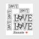 Inscrição ocidental desagradável da palavra "LOVE" com o "O" substituído pelo estado do Texas com um coração cortado. Disponível em laranja queimada UT Longhorns, marrom da Texas A&M Aggies, Texas Tech Raiders red, preto, bandeira azul do estado, verde do cacto e roxo do marrom. Na folha extra pequena, o adesivo grande tem cerca de 2" de largura, os pequenos adesivos de 1" de largura.
