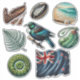 Adesivo do Conjunto de Coisas Kiwis da Nova Zelândia 1. © Escolha um Adesivo. Esta folha de 8 adesivos são todos de coisas Kiwis da Nova Zelândia, que incluem imagens estilizadas de uma canoa Maori, uma bola de rugby, um fronde de samambaia, um pássaro Tui, uma arma de jade Maori, uma bandeira da NZ rasgada, um fronde de samambaia enrolado e uma pequena cena de praia.