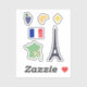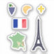 Uma coleção de autocolantes de símbolos franceses: Torre Eiffel, bandeira vermelha azul branca, croissant, Fleur de lys real, vinhas de uvas, mapa!