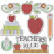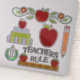 Todos os quadrantes do professor da escola têm uma folha de autocolante com gráficos de maçãs vermelhas, livros empilhados, lápis, régua e símbolo de educação. O texto gráfico preto, com a régua, lê Regra dos Professores.