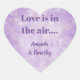 Este adesivo roxo em bokeh com coração contém "Amor no ar" e o nome do casal abaixo. Peça o seu agora!