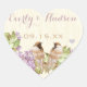 Lavanda Lilac Love Bird Wedding Heart Sticker. Lavanda e Ouro do Selo de Casamento do Tan. Informações sobre lavandas Manuais Tipografia e Rochas de Bronze sobre um Ramo de Árvore Adorável cobrindo flores de primavera mole com duas aves de amor românticas, doçamente sentadas ao lado uma da outra.Casamentos de aves venenosas e excelentes de Ocasiões Especiais para Favores de Casamento ou Focos de Casamento para Envelopes de Convite
