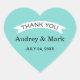 O design de adereço de casamento personalizado apresenta um estilo chic e sofisticado. O adesivo em forma de coração inclui um detalhe de fita branca com o texto personalizado "Obrigado" e o monograma dos nomes de noiva e noivo e a data do casamento. Esquema de cor azul, preto e branco do ovo de Aqua / robin.