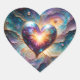 A luminous heart-shaped object glows at the center, surrounded by vibrant cosmic swirls. Small spherical orbs add depth to the celestial scene.
