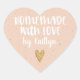 Um adesivo "caseiro com amor" personalizado com coração dourado num fundo cor-de-rosa em forma de coração. Faça-o seu adicionando seu próprio nome. Um toque bonito para todos os presentes de Dia de os namorados caseiro e outras ocasiões de doação de presente. Projetado para você pelo Blackberry Boulevard.