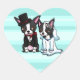 Caracterizando um par adorável de terrier de Boston dos desenhos animados vestidos como uns noivos. O noivo veste um smoking preto e branco de busca com um laço vermelho e a noiva veste um vestido branco bonito e um véu decorados com flores. Aperfeiçoe para amantes do cão!