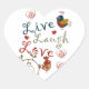 Love Birds T-shirts, canecas, ímanes, mousepads, cartões, adesivos, chaveiros, botões, travesseiros, relógios de parede, bolsas e mais com dois pássaros, muitos corações, ramos irregulares de folhas, e texto que lê Live Laugh Love.