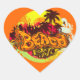 Uma ilustração divertida de uma cena de praia com pessoas dançantes, palmeiras, o sol e uma praia.