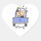 Uma noiva e noiva de figura de palito em um carro de casamento azul e um texto que lê Recem casados na noiva e noiva, canecas, bolsas, manequins, guardas, cartões, adesivos, chaveiros, cartazes, cartazes, cartazes, aglutinantes e outras noivas de vassoura e artigos de design de carro de noiva.