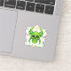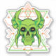 Um crânio verde vibrante toma o palco central, seus olhos amarelos brilhantes perfurando a escuridão. O crânio é enfeitado com dois chifres longos e curvos que se destacam dos lados da cabeça, acrescentando à sua aparência ameaçadora. O crânio é enquadrado por uma complexa rede de formas geométricas, incluindo triângulos, quadrados e linhas, em tons de laranja e verde. Esses padrões criam uma sensação de mistério e intrigação, sugerindo uma conexão com o sobrenatural ou oculto.