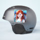 Uma menina de olhos azuis com cabelos vermelhos com arte de rua de grafite ao fundo.