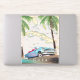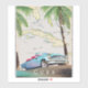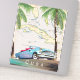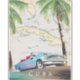 Mapa ilustrado de Cuba (além das ilhas circundantes) em um belo estilo vintage detalhado com um carro cubano clássico no pôr do sol.