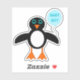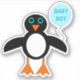 Este adesivo em forma espetacular apresenta um desenho fofo de um pinguim azul com olhos azuis, um pequeno bico laranja e uma barriga branca. O pinguim está segurando um balão azul em pó. Há texto azul pálido dentro no balão que diz, "Bebê rapaz". Este é o presente perfeito para celebrar um bebê recém-nascido.
