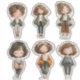 Each sticker shows a full-body standing chibi girl character with soft facial features, rosy cheeks, and peaceful expressions, presented in slightly varied poses, outfits, and accessories while maintaining a cohesive and harmonious look.
