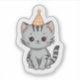 Celebrate in style with this purr-fectly cute grey tabby kitten sticker! Featuring a sweet sitting kitten wearing an orange polka-dot party hat, this design is sure to bring a smile to any cat lover's face. The soft, kawaii illustration style makes it a wonderful addition to birthday cards, gift wrap, planners, or water bottles. Whether you are decorating for a party or just love cute animals, this little party cat is ready to celebrate with you.