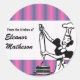 Uma ilustração vintage de um padeiro contra um fundo listrado tonal púrpura da base visual para este adesivo fofo. Use a expressão "Da Cozinha de" ou torne-a sua e adicione seu próprio nome (ou de outra pessoa). Escreva no seu nome de prato abaixo. Disponível em designs e combinações de cores alternativas.
