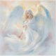 Um anjo luminoso com tecido branco cascata e asas de ouro, flutuando suavemente através de um céu pastel.