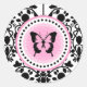 Um design cor-de-rosa, branco e preto com uma borboleta preta no centro