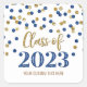 Classe de nome personalizado de adesivos de graduação 2023 com padrão de configuração de ouro e azul com texto de estilo moderno e escrito.