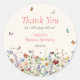 Este é um adesivo de agradecimento colorido e boêmio para uma festa de noiva. O design apresenta florais elegantes e estivais de flores silvestres delicadas em tons pastel em belas tonalidades de azul, terracota, rosa, ferrugem, roxo e amarelo. As borboletas e abelhas adicionam o toque caprichoso final.