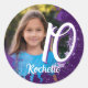 Adicione um pouco de pizzazz à sua 10ª festa de aniversário com adesivos personalizados para fotos, com design de tinta púrpura spray. Os adesivos são personalizáveis onde você pode adicionar sua própria foto e nome.